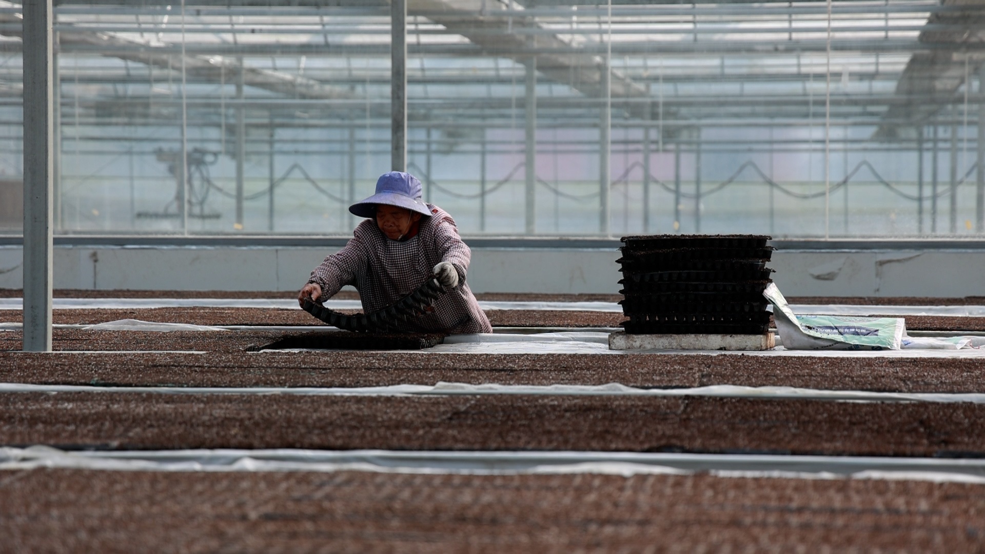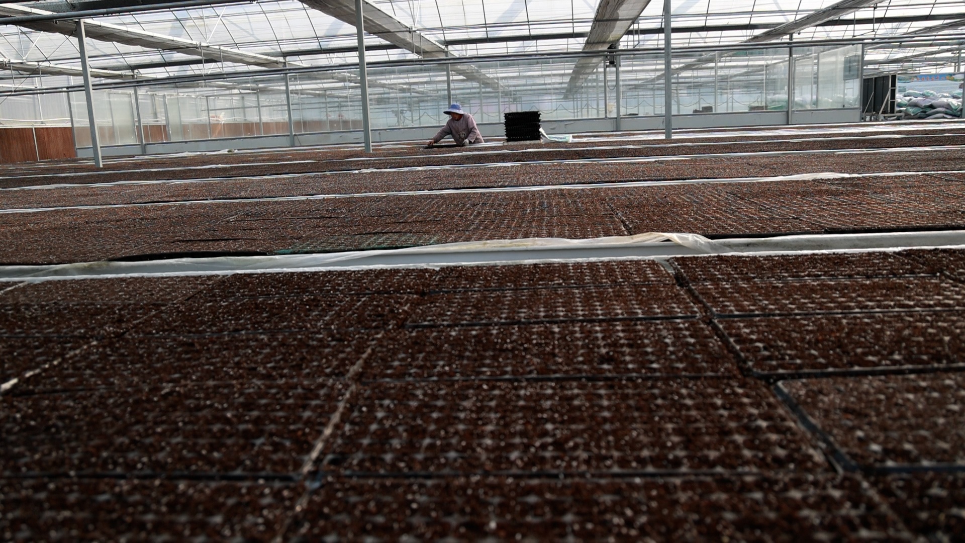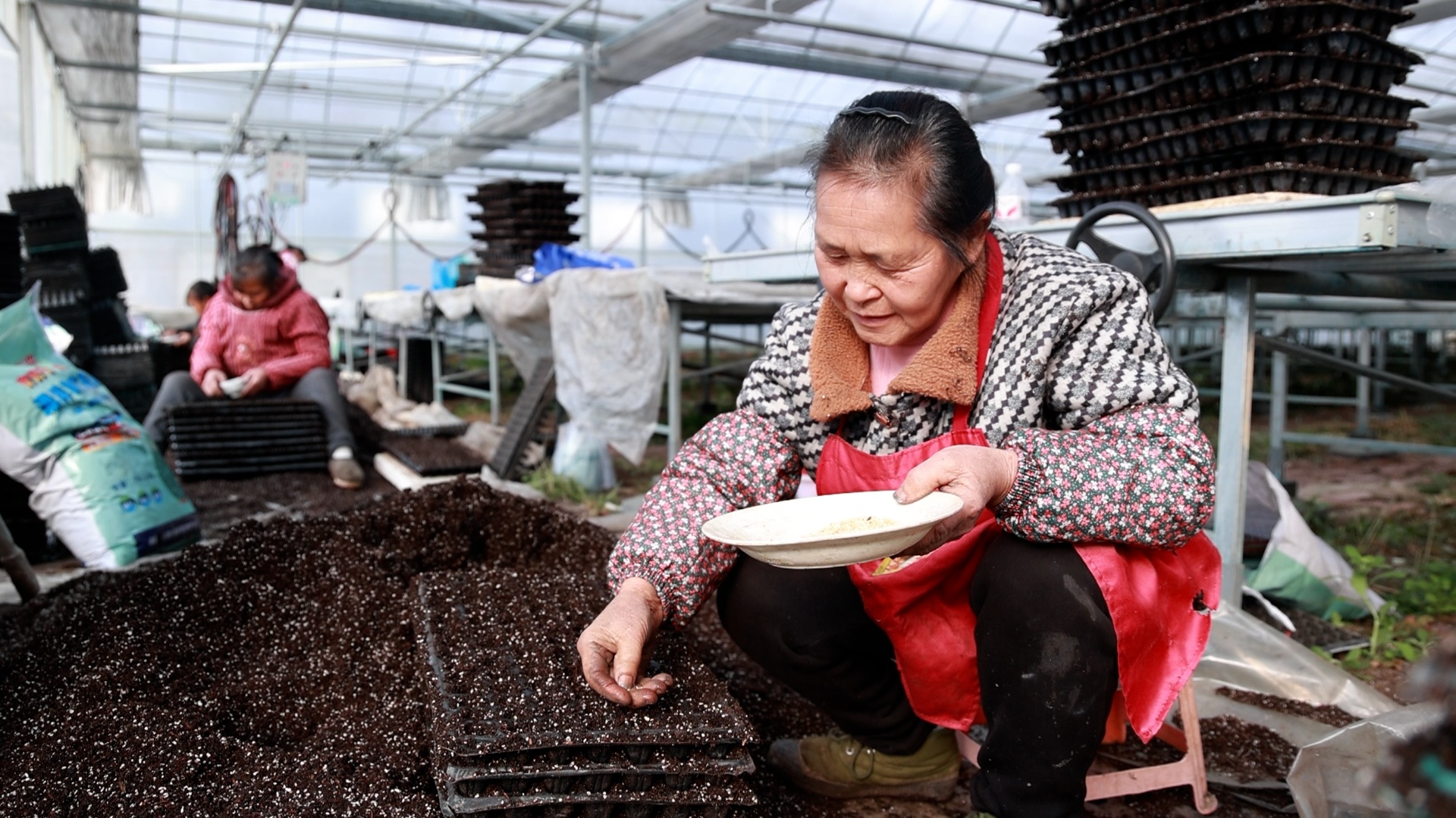 在大棚内穴盘育苗区,工人们正忙着拌基料、点种、摆盘,动作利索,配合默契,一盘盘规整摆放的育苗盘里,孕育着新年增收的期望。